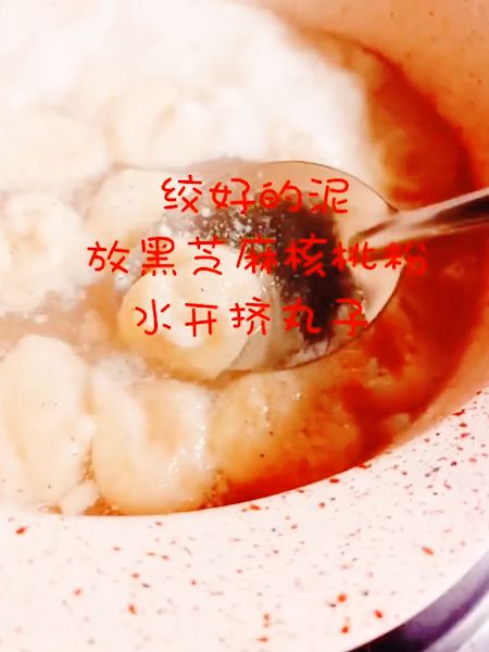 3、絞好的泥,放黑芝麻核桃粉,水開擠丸子