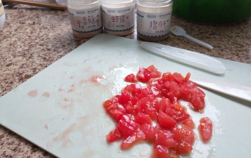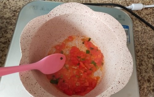 3、放鑫百味核桃油,爆香蔥花。炒出西紅柿的湯汁,加一點(diǎn)已經(jīng)燒開的水,如果喜歡喝湯可稍多加一點(diǎn)水。