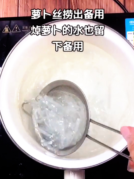3、蘿卜絲撈出備用,焯蘿卜的水也留下備用。