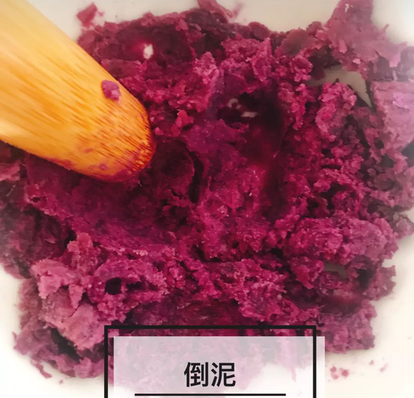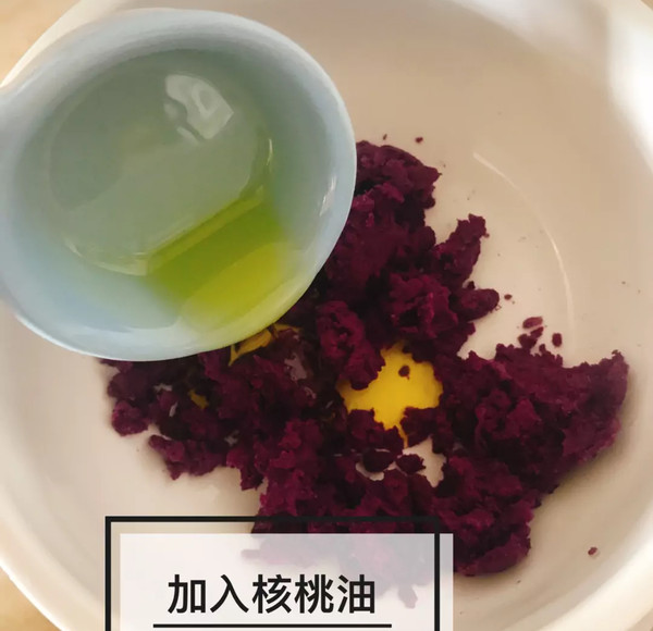 3、接著在紫薯泥中加入適量的鑫百味核桃油。