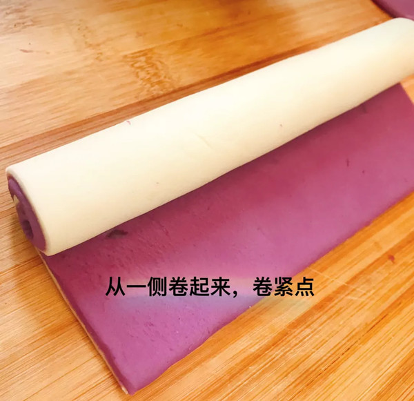 7、接著搟成薄餅,兩個疊起來,從一側(cè)卷起來。