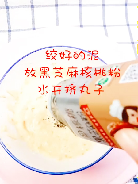 3、絞好的泥,放黑芝麻核桃粉,水開擠丸子