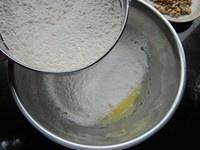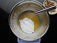 1、鑫百味核桃油內(nèi)加入蛋黃均勻攪打