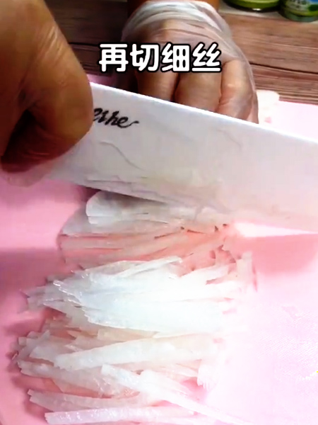 1、取一段白蘿卜,切薄片,再切細(xì)絲。