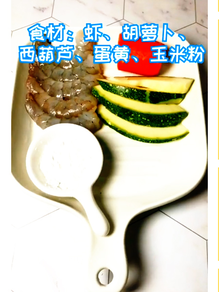 1、準(zhǔn)備食材:蝦,胡蘿卜,西葫蘆,蛋黃,玉米粉。